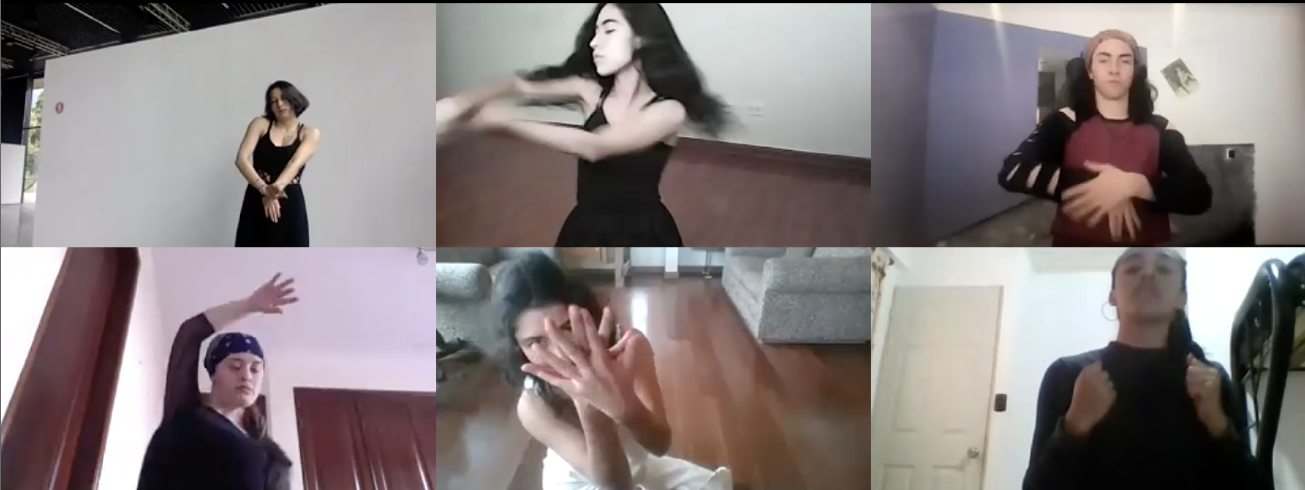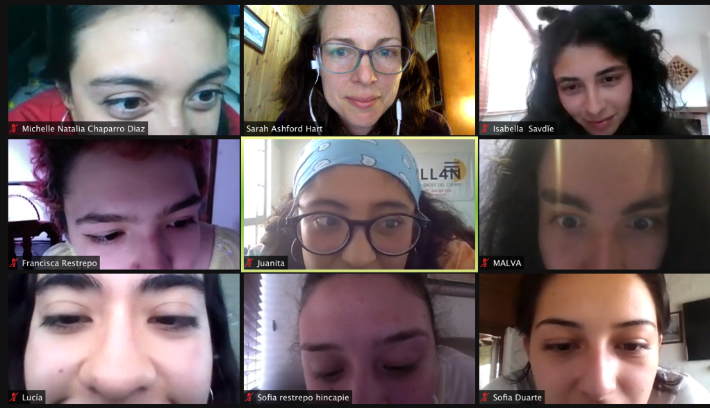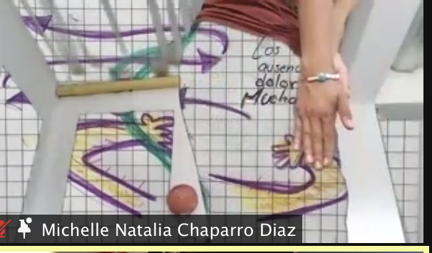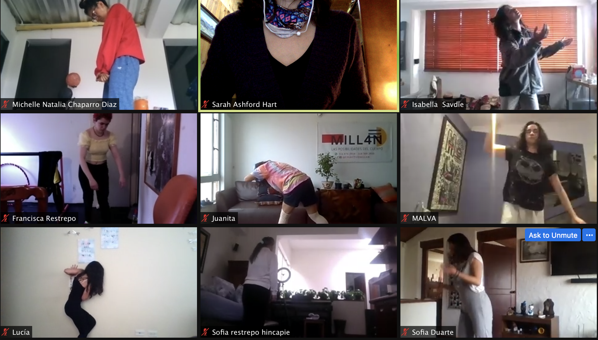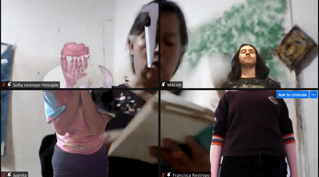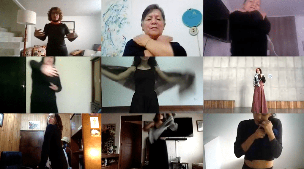 Embodied Anastasis [Anastasis Corporal] was a collective creation I co-facilitated in 2020 with participants/co-researchers from the Bogotá-based female victims’ group Anastasis. Moving-with Embodied Anastasis sprang from the need to find active ways for audiences to engage with Anastasis’ performance, in the context of an ever-more virtual and unequal reality. Our initial research questions were: how do their voices move us, how do their words affect us, and how do their experiences implicate us? With students from the Universidad Javeriana in Bogotá, I created improvised movement scores in response to these questions and invited Zoom audiences to join us in listening from the body (individual and collective, virtual and physical). We found that moving together while listening facilitated a feeling of copresence, even when we were not physically in the same place, and this made us feel viscerally response-able to the histories of violence that were narrated (a sense of responsibility and ability to respond).