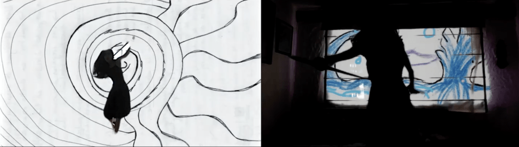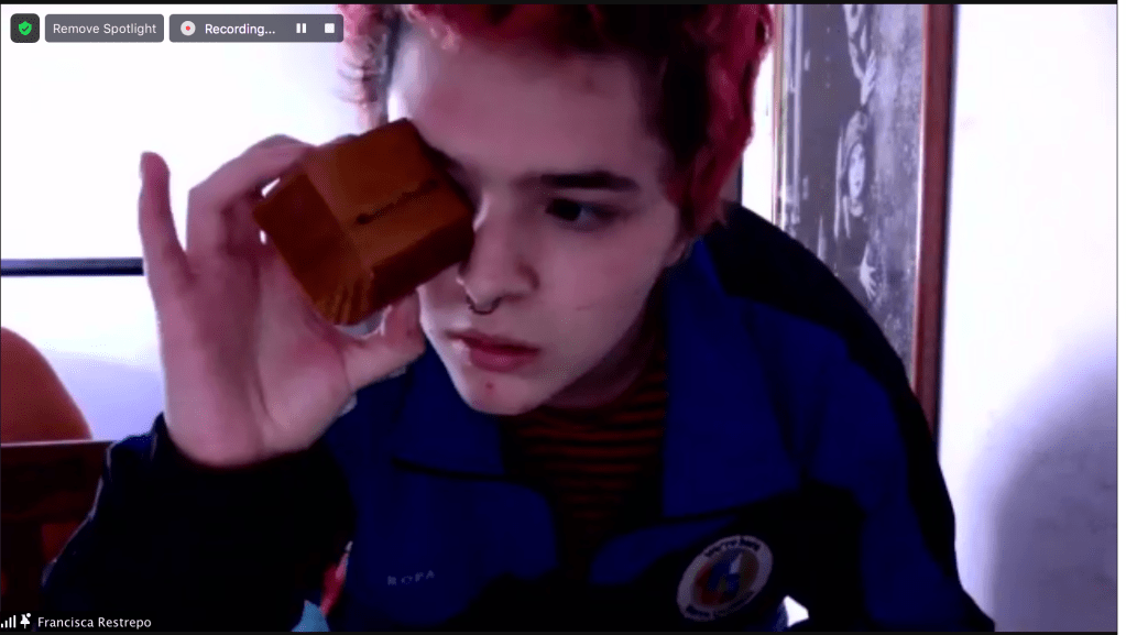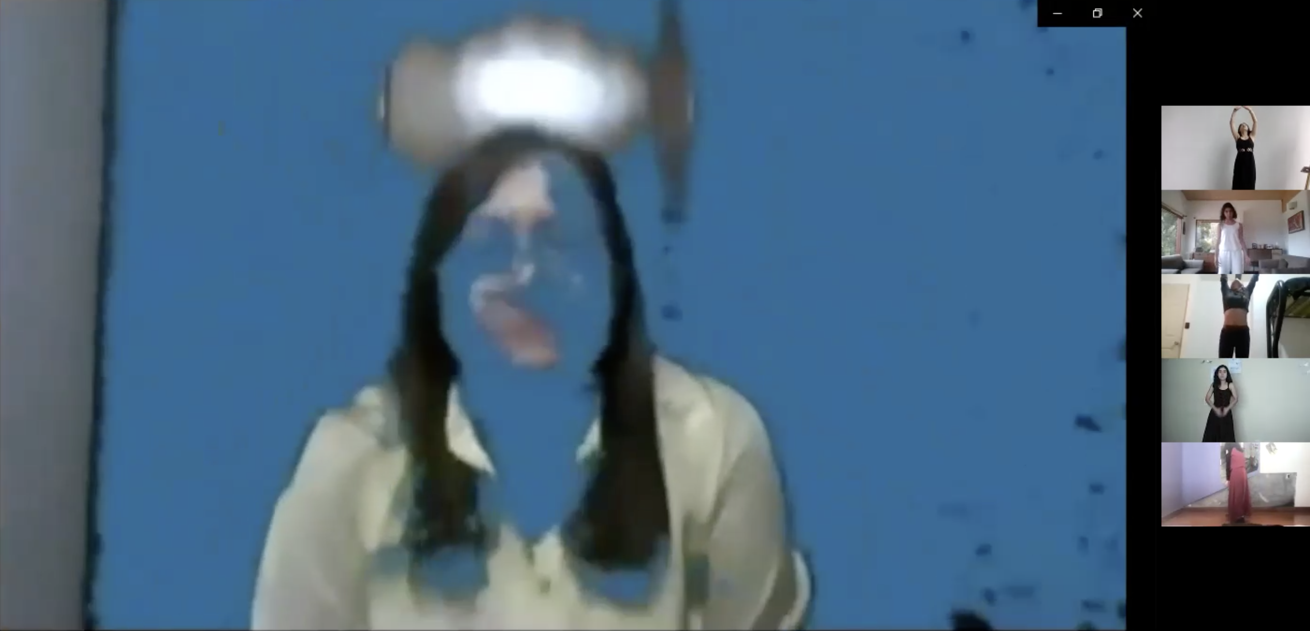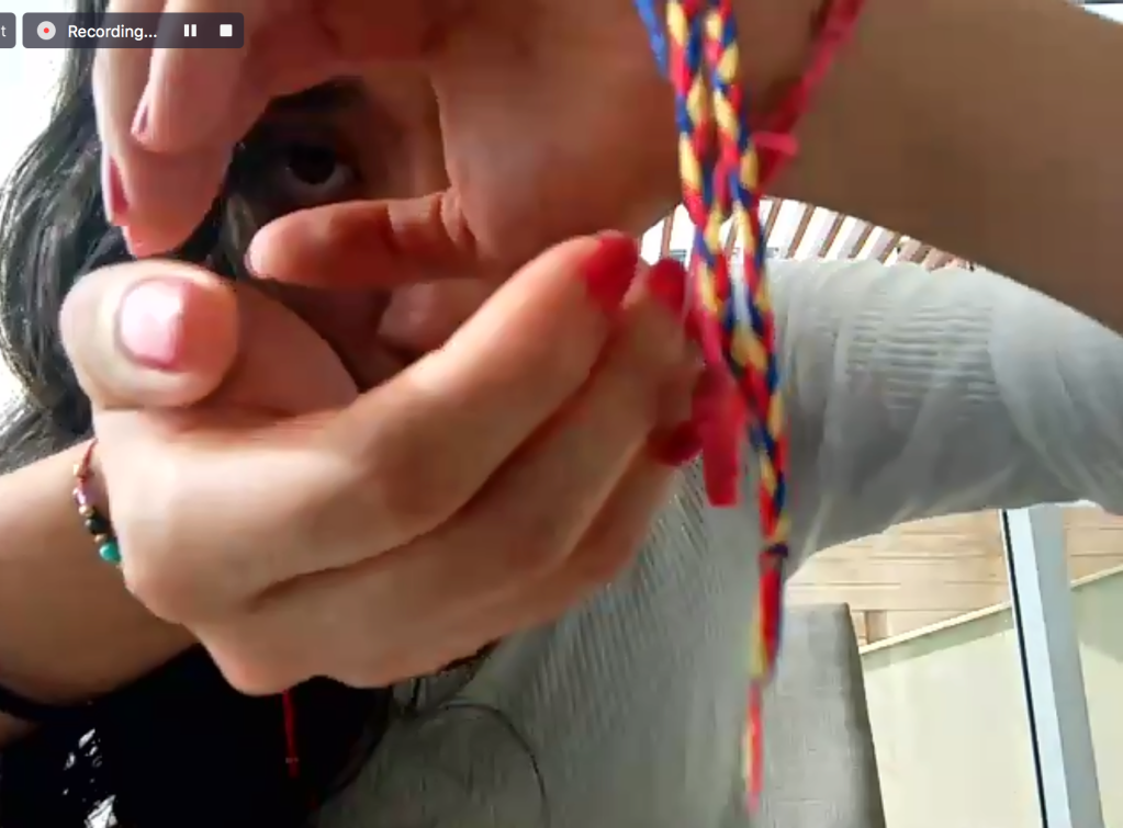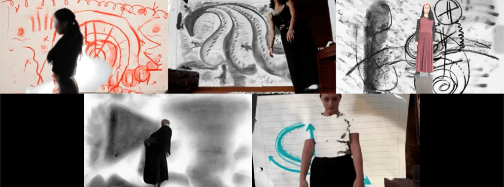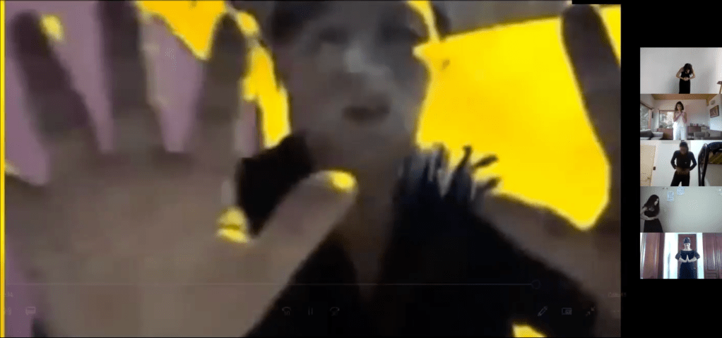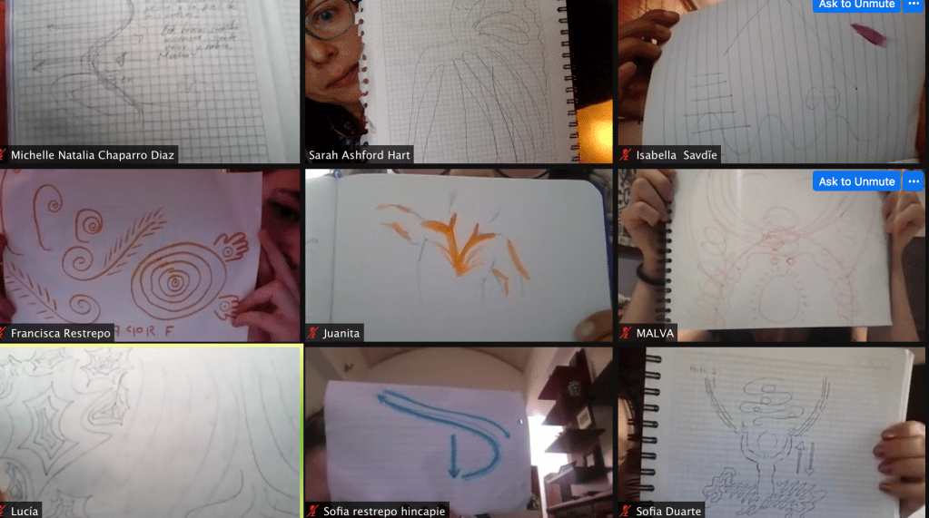 The guided journey we crafted for audiences of our interactive Zoom performance aimed to sensitize the students’ friends, families and university colleagues to their capacity to be affected collectively by Anastasis’ embodied testimonies of violence and healing; it went from watching and listening to writing and drawing and finally moving and speaking. It was not about putting ourselves (relatively privileged audiences with no direct experience of the armed conflict) in Anastasis’ shoes, but sensitizing ourselves to how their experience related to us, to our experiences, and to our own embodied memories.