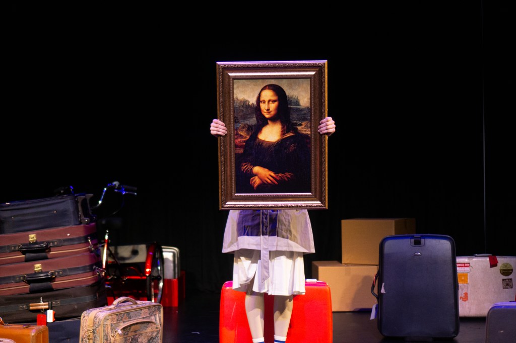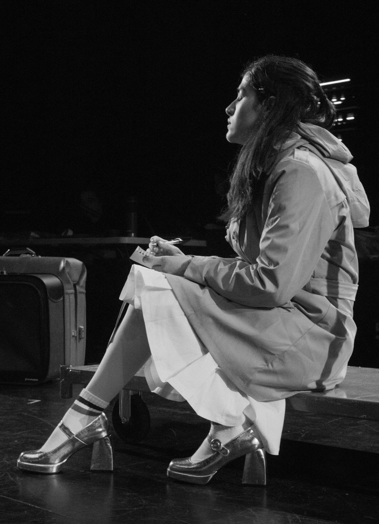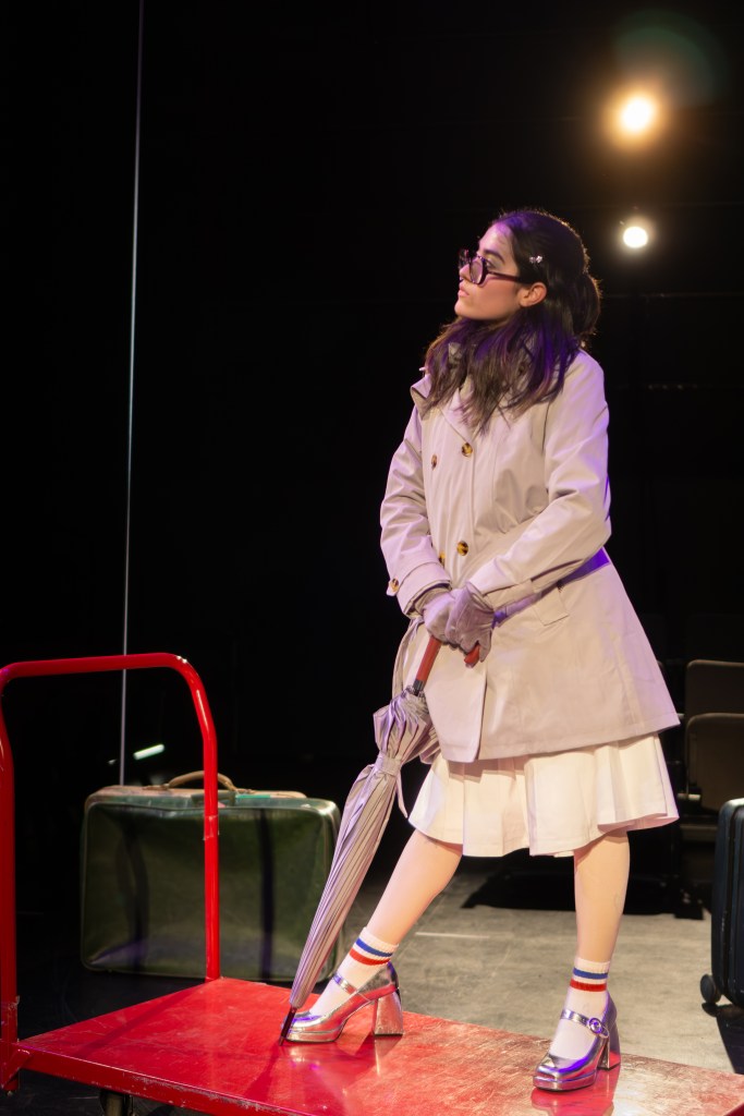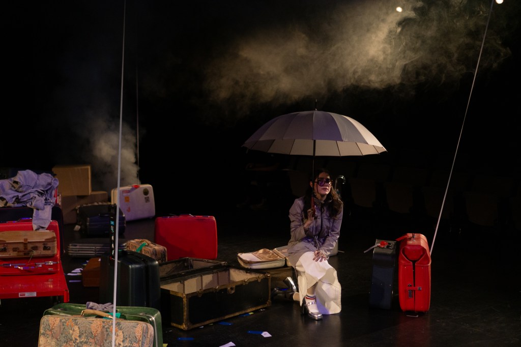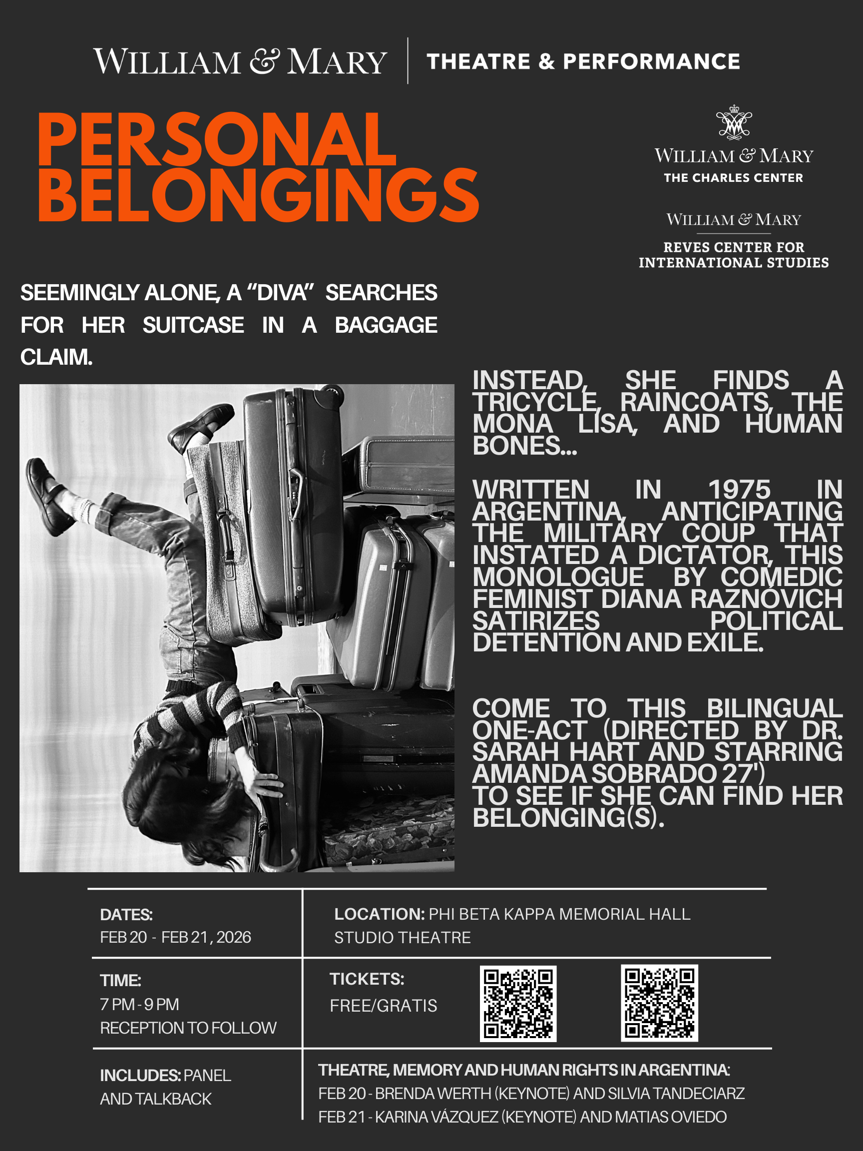 I directed a university production Personal Belongings at William & Mary’s Department of Theatre & Performance in Spring 2026. This rarely produced one-act monologue by Argentine feminist playwright Diana Raznóvich was written in 1975, anticipating the military coup that would install a dictatorship, which waged a “dirty war” on its citizens (1976-1983), supported by the US. The play is a satire on political detention and exile, taking audiences through a whirlwind of tragic, absurd events, as a “Diva” loses her sense of place and self. Seemingly on her own, she searches for her belongings among piles of suitcases in a baggage claim, where she remains trapped.