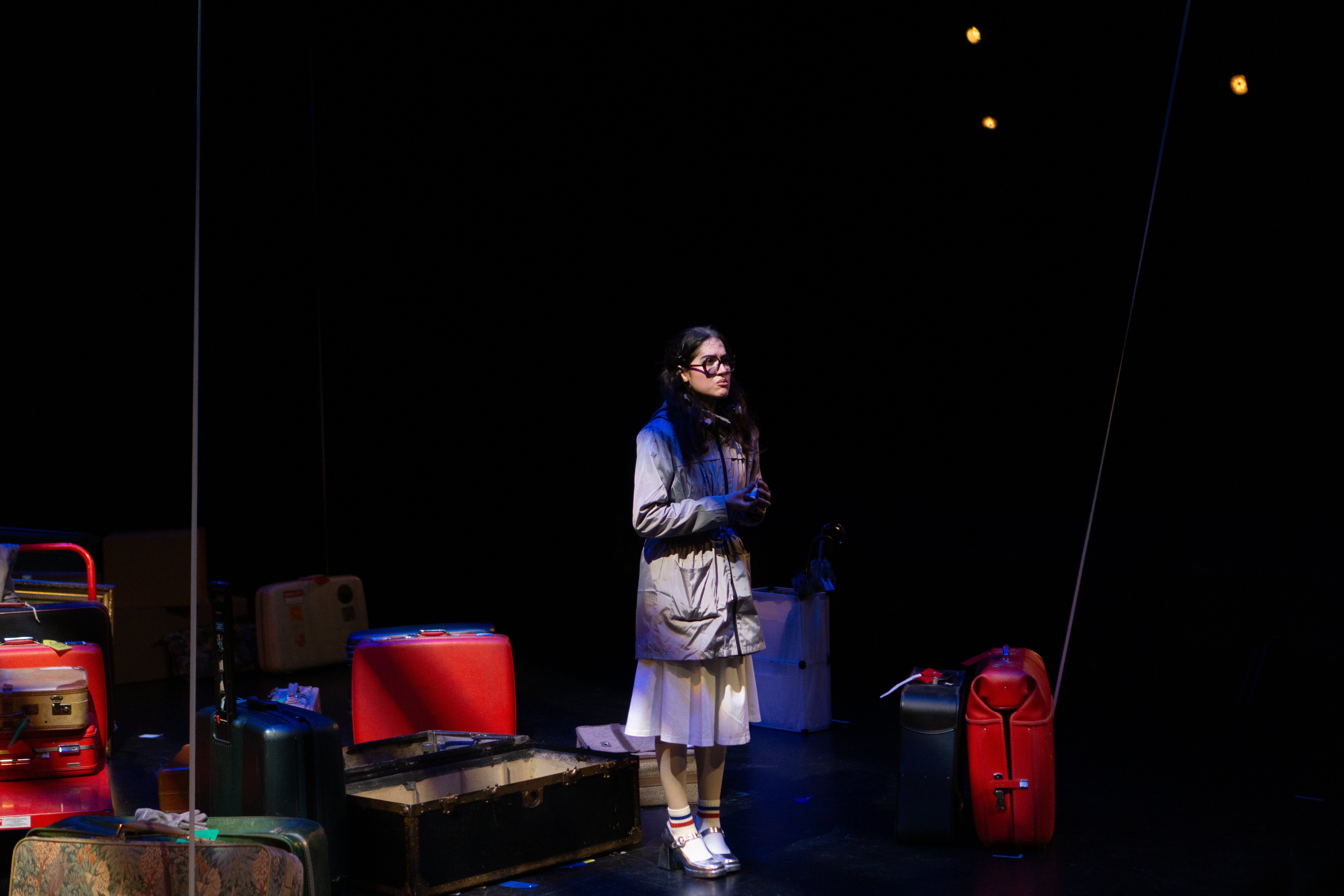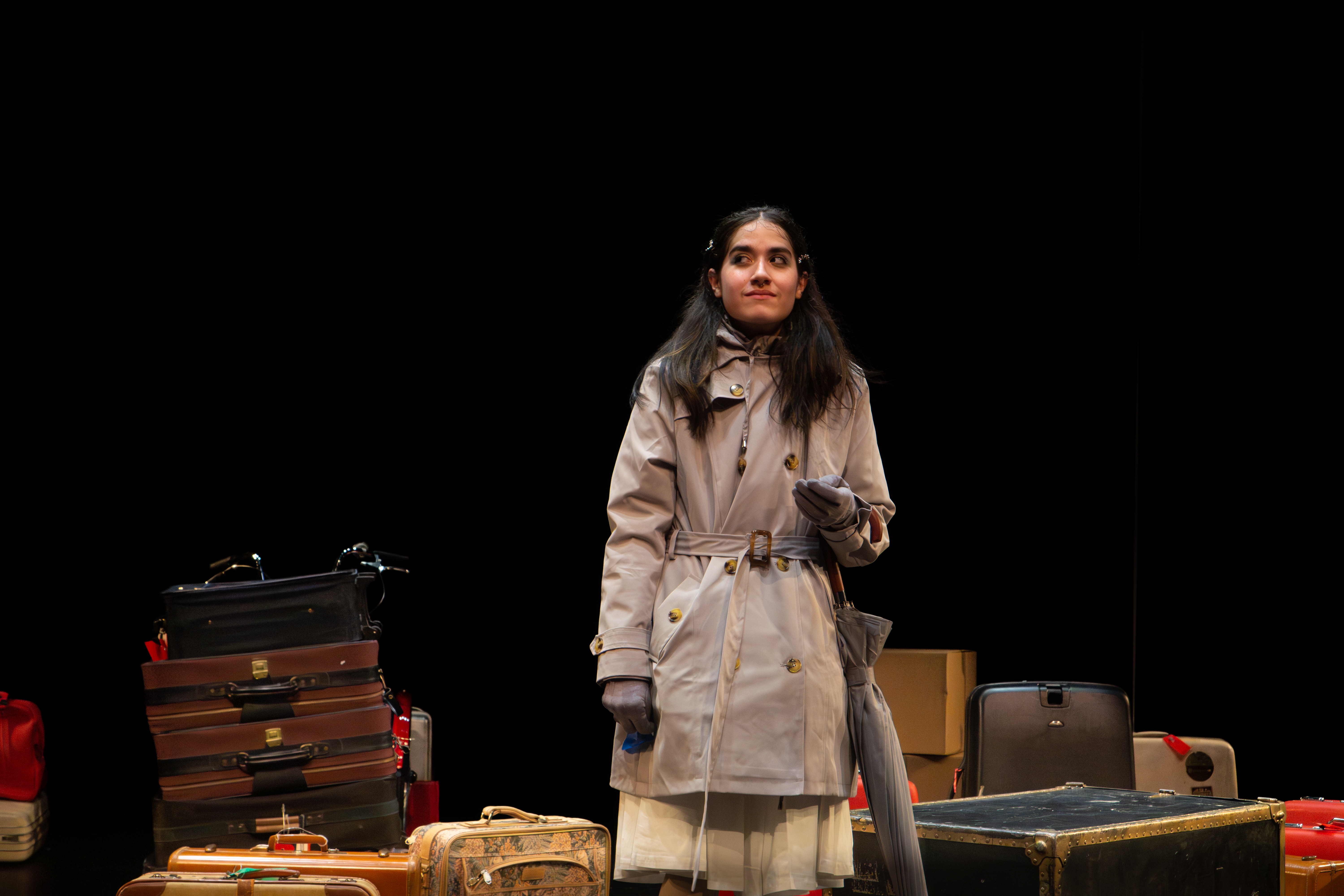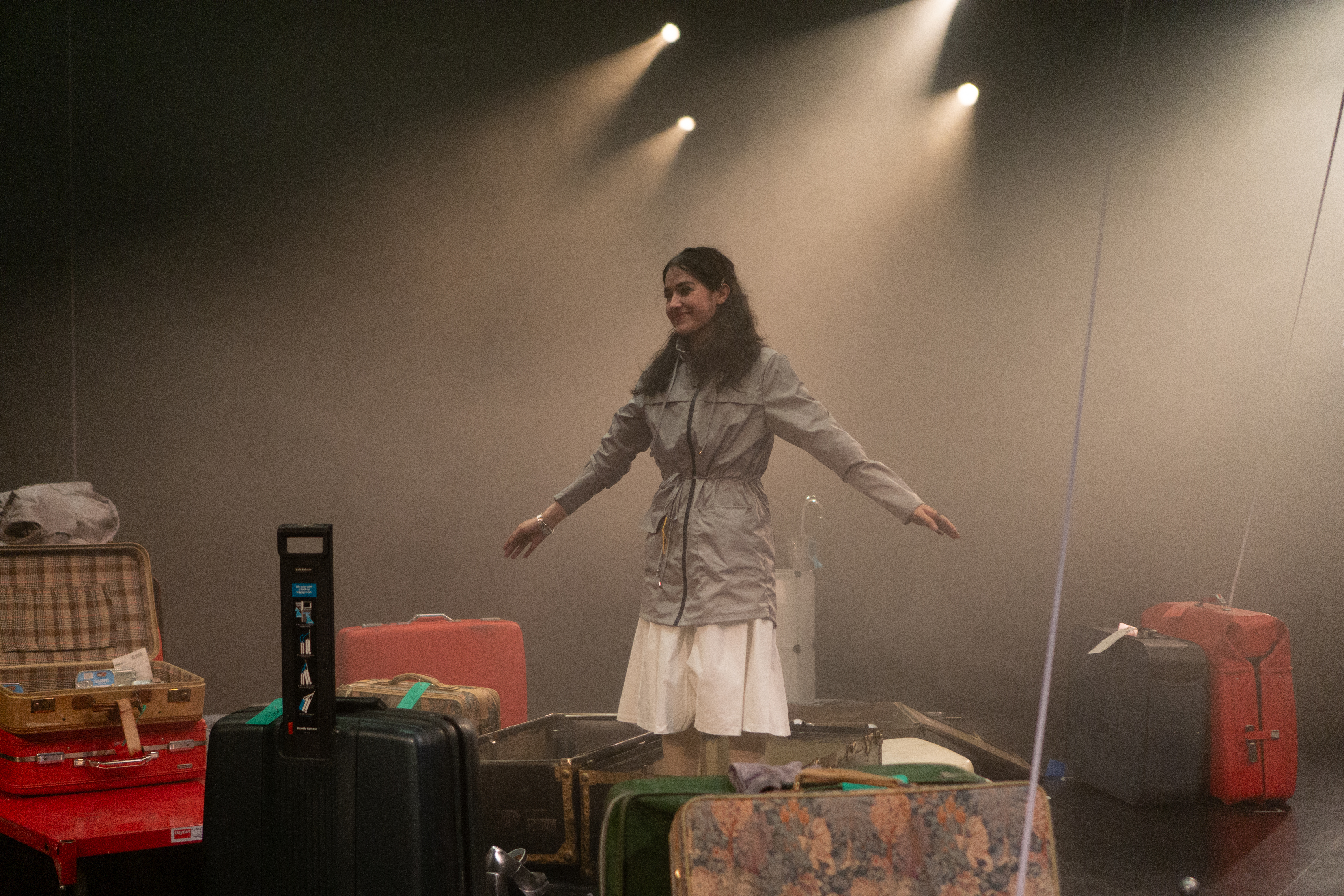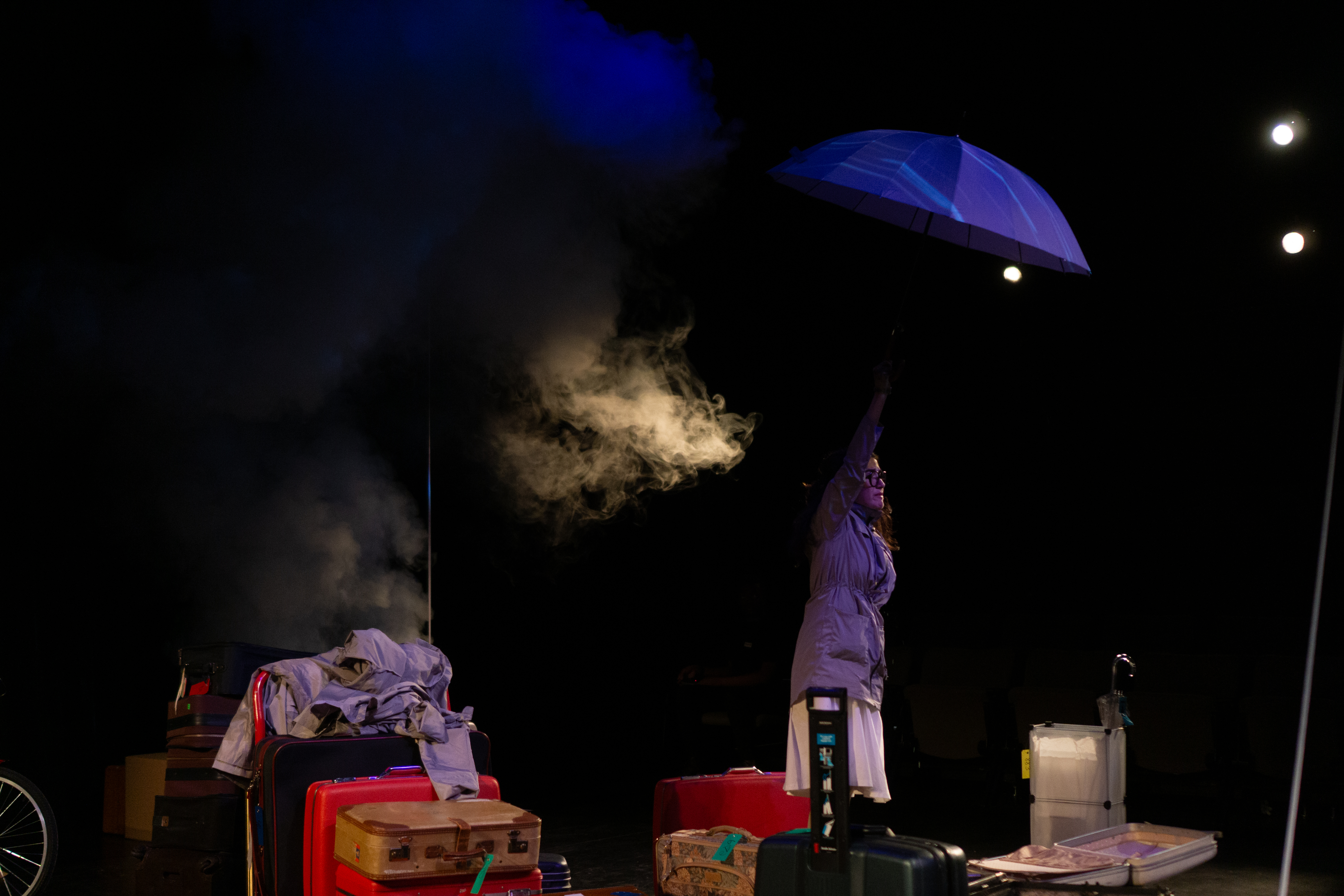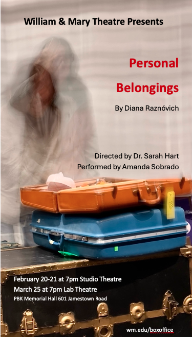 I directed a university production Personal Belongings at William & Mary’s Department of Theatre & Performance in Spring 2026. This rarely produced one-act monologue by Argentine feminist playwright Diana Raznóvich was written in 1975, anticipating the military coup that would install a dictatorship, which waged a “dirty war” on its citizens (1976-1983), supported by the US. The play is a satire on political detention and exile, taking audiences through a whirlwind of tragic, absurd events, as a “Diva” loses her sense of place and self. Seemingly on her own, she searches for her belongings among piles of suitcases in a baggage claim, where she remains trapped.