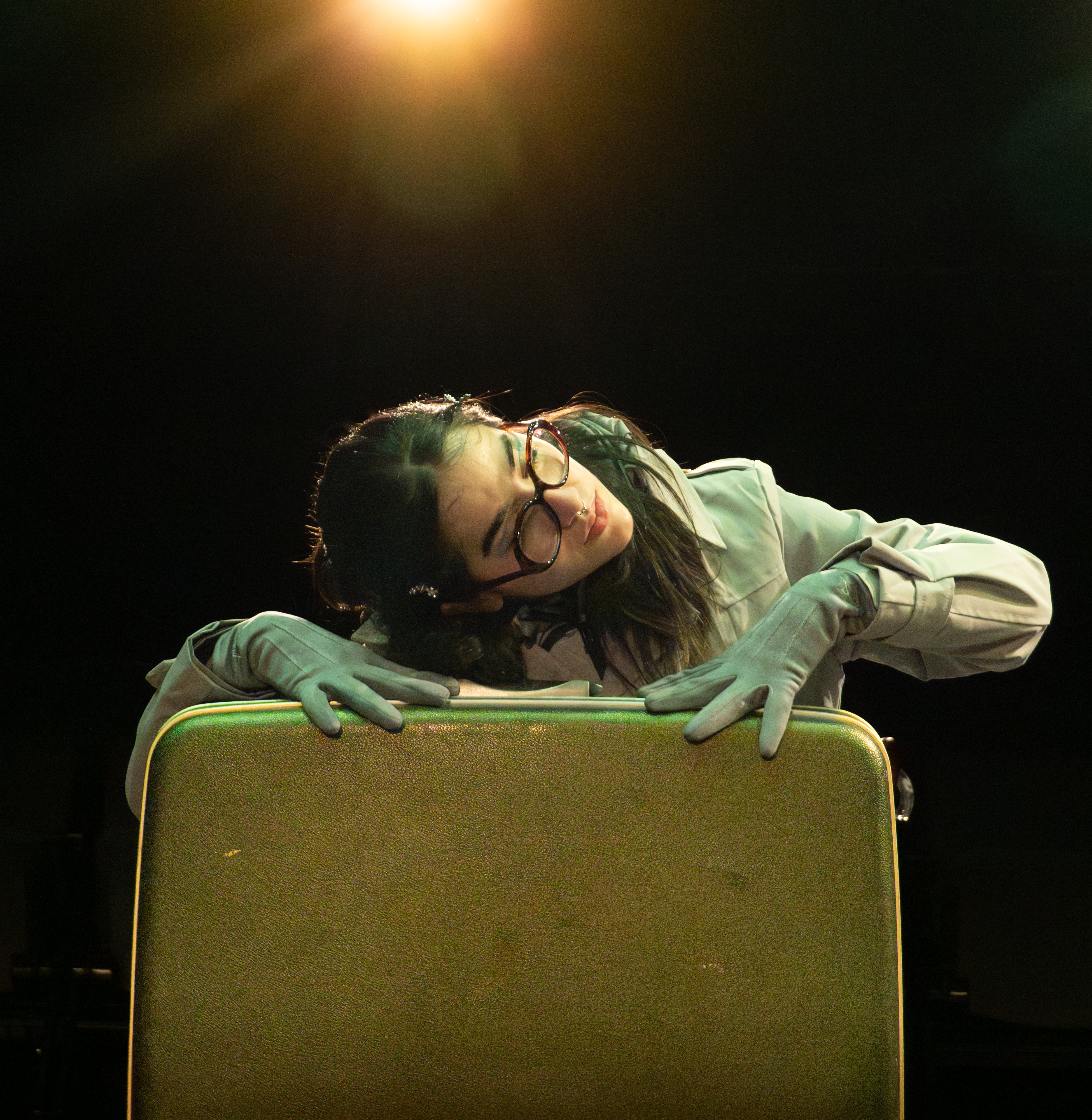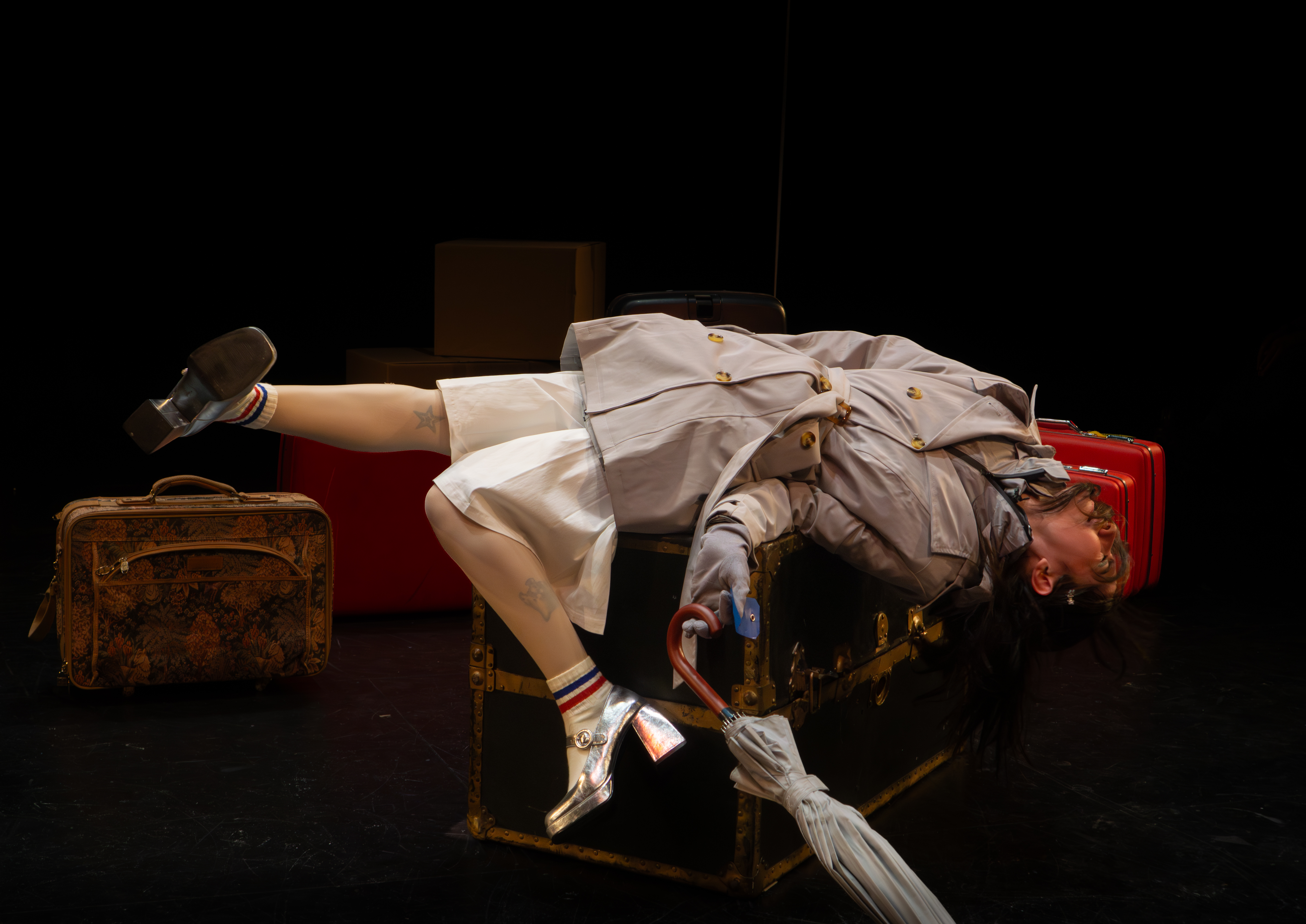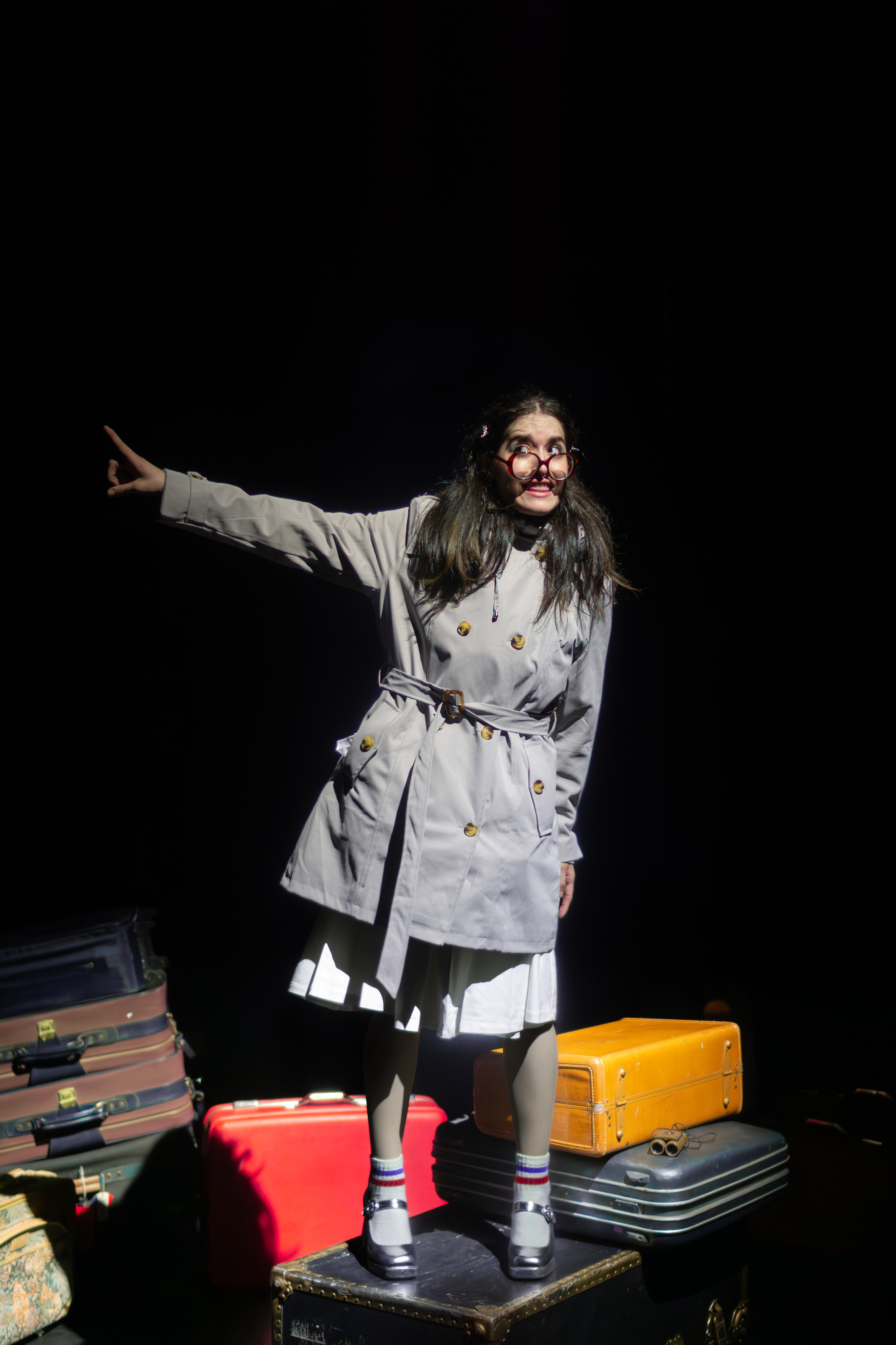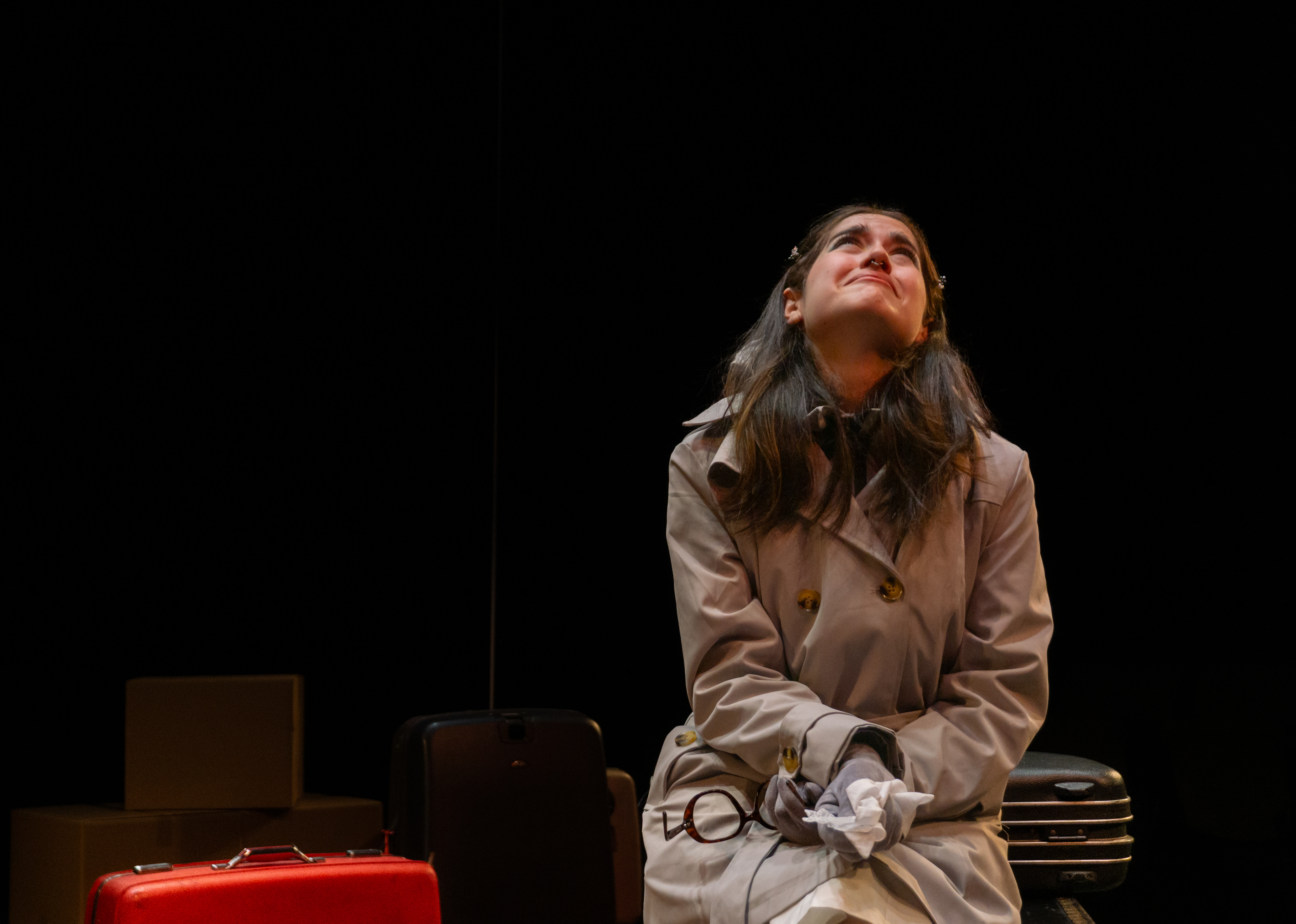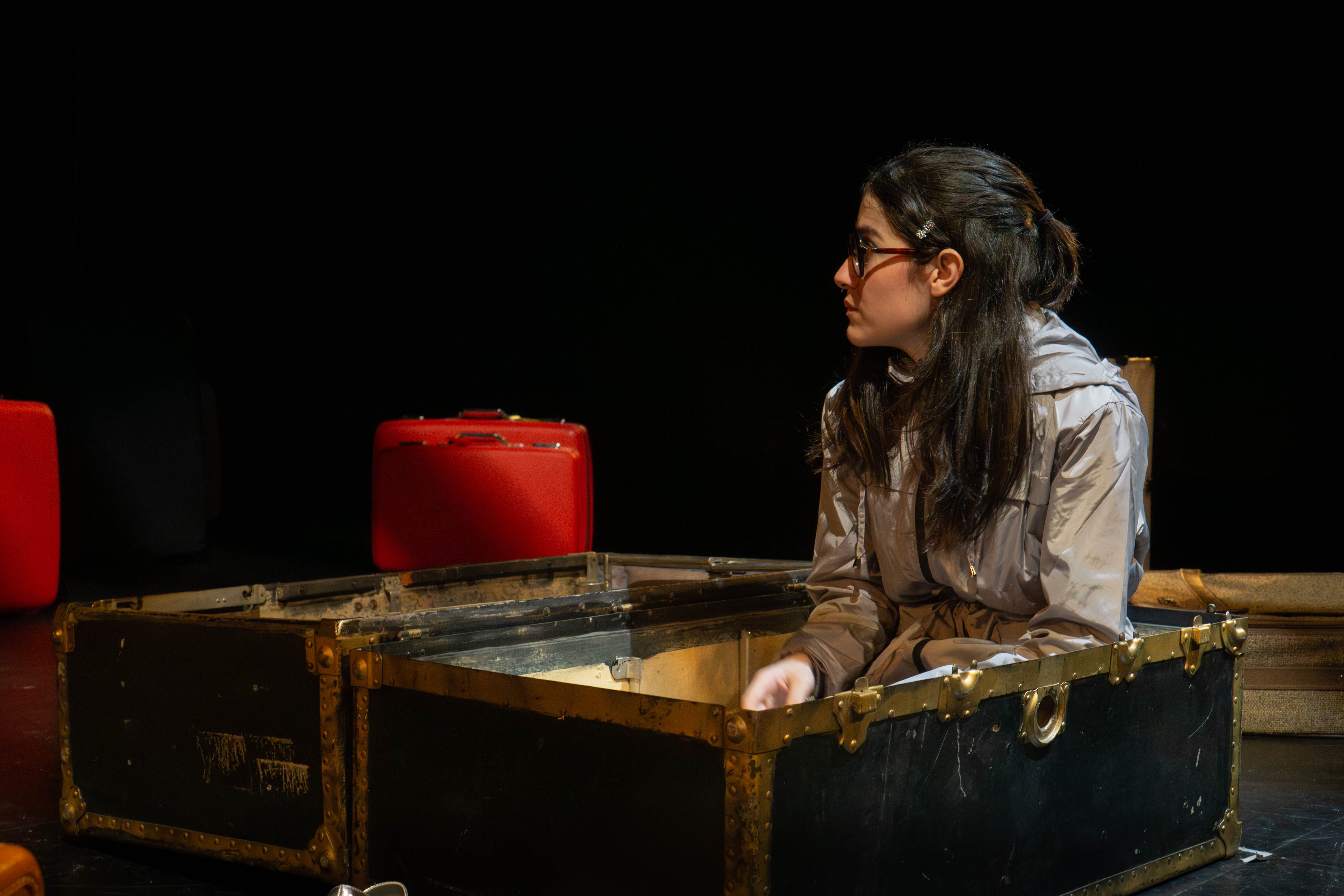 I directed a university production Personal Belongings at William & Mary’s Department of Theatre & Performance in Spring 2026. This rarely produced one-act monologue by Argentine feminist playwright Diana Raznóvich was written in 1975, anticipating the military coup that would install a dictatorship, which waged a “dirty war” on its citizens (1976-1983), supported by the US. The play is a satire on political detention and exile, taking audiences through a whirlwind of tragic, absurd events, as a “Diva” loses her sense of place and self. Seemingly on her own, she searches for her belongings among piles of suitcases in a baggage claim, where she remains trapped.