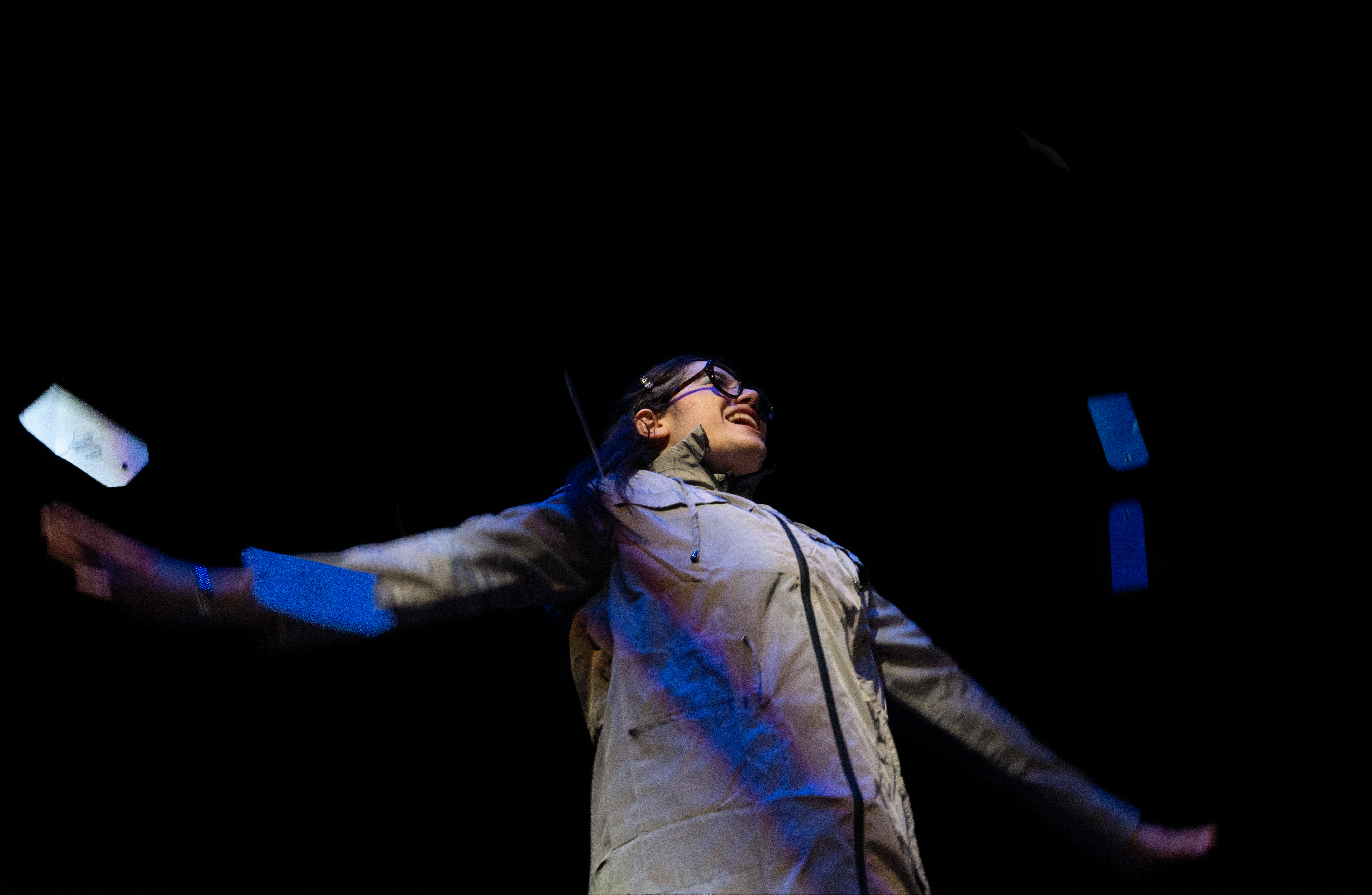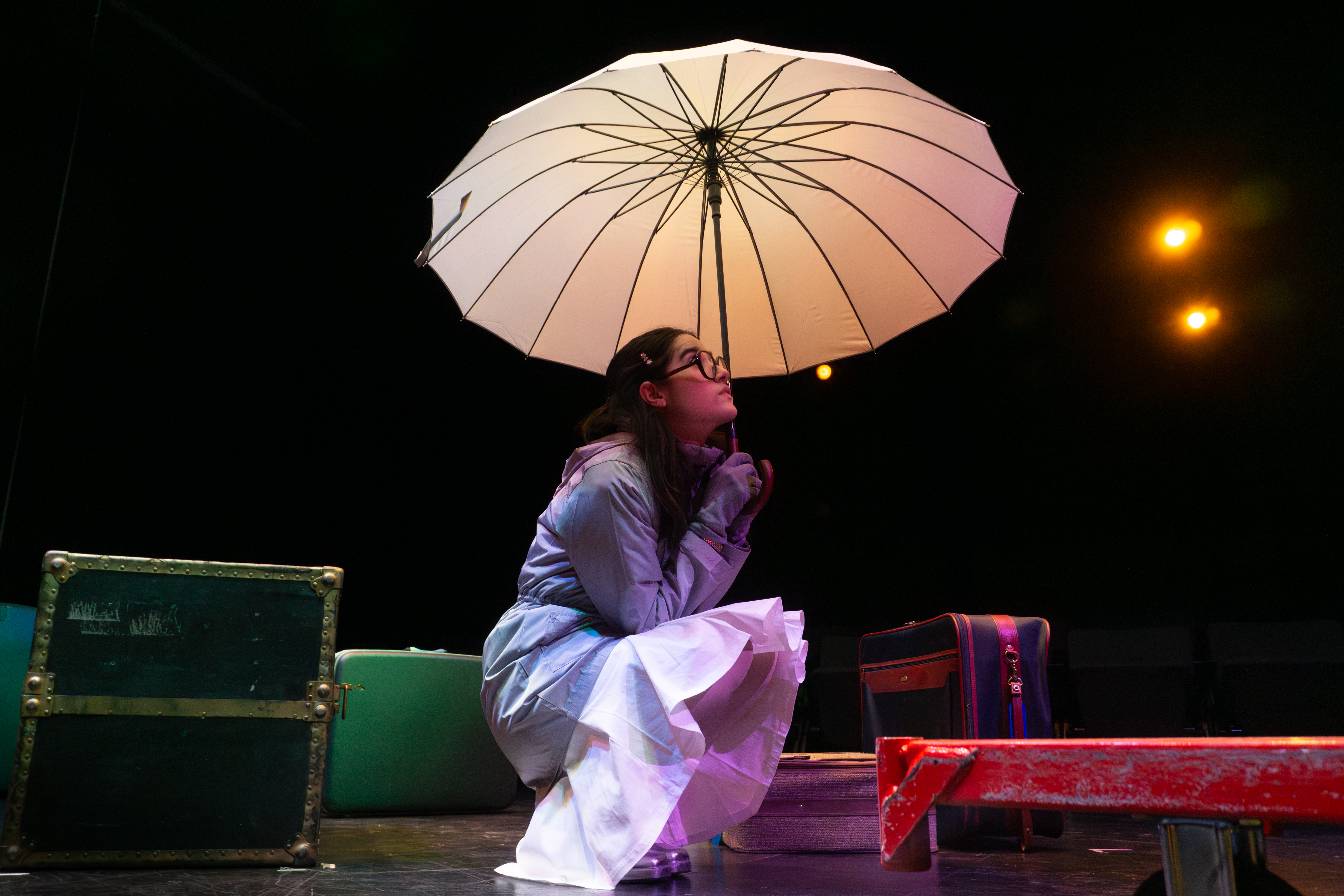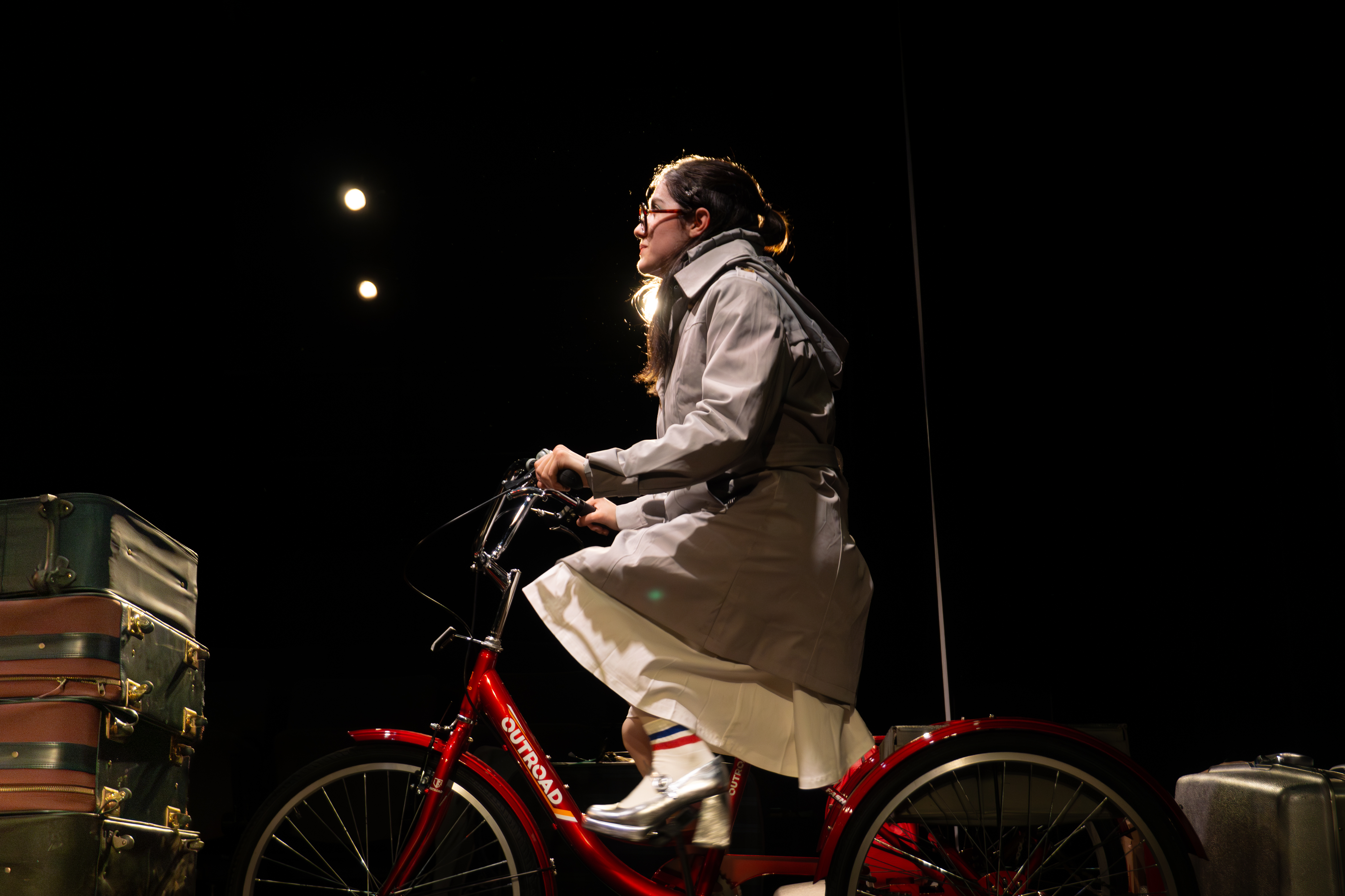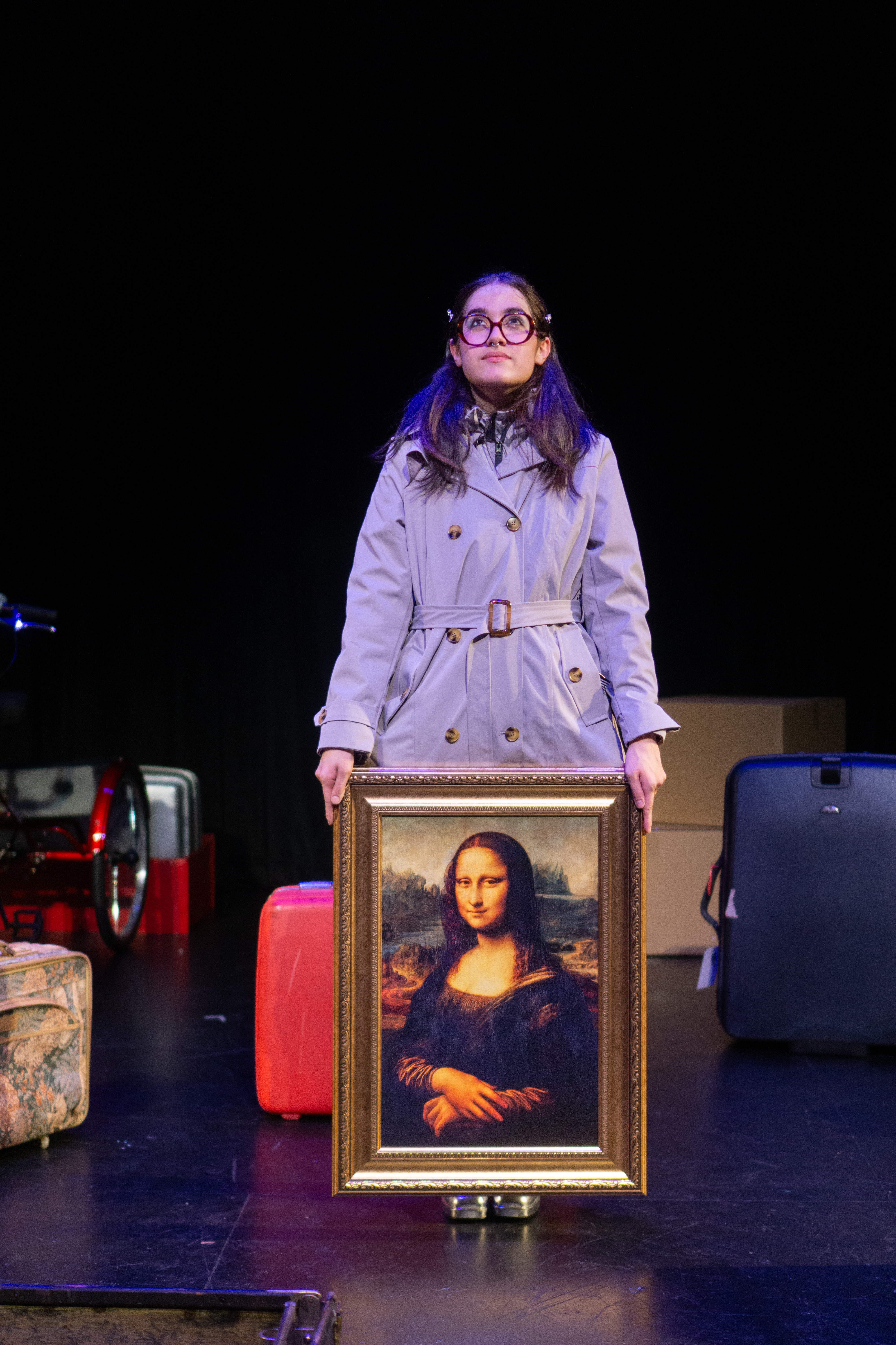 I directed a university production Personal Belongings at William & Mary’s Department of Theatre & Performance in Spring 2026. This rarely produced one-act monologue by Argentine feminist playwright Diana Raznóvich was written in 1975, anticipating the military coup that would install a dictatorship, which waged a “dirty war” on its citizens (1976-1983), supported by the US. The play is a satire on political detention and exile, taking audiences through a whirlwind of tragic, absurd events, as a “Diva” loses her sense of place and self. Seemingly on her own, she searches for her belongings among piles of suitcases in a baggage claim, where she remains trapped.
